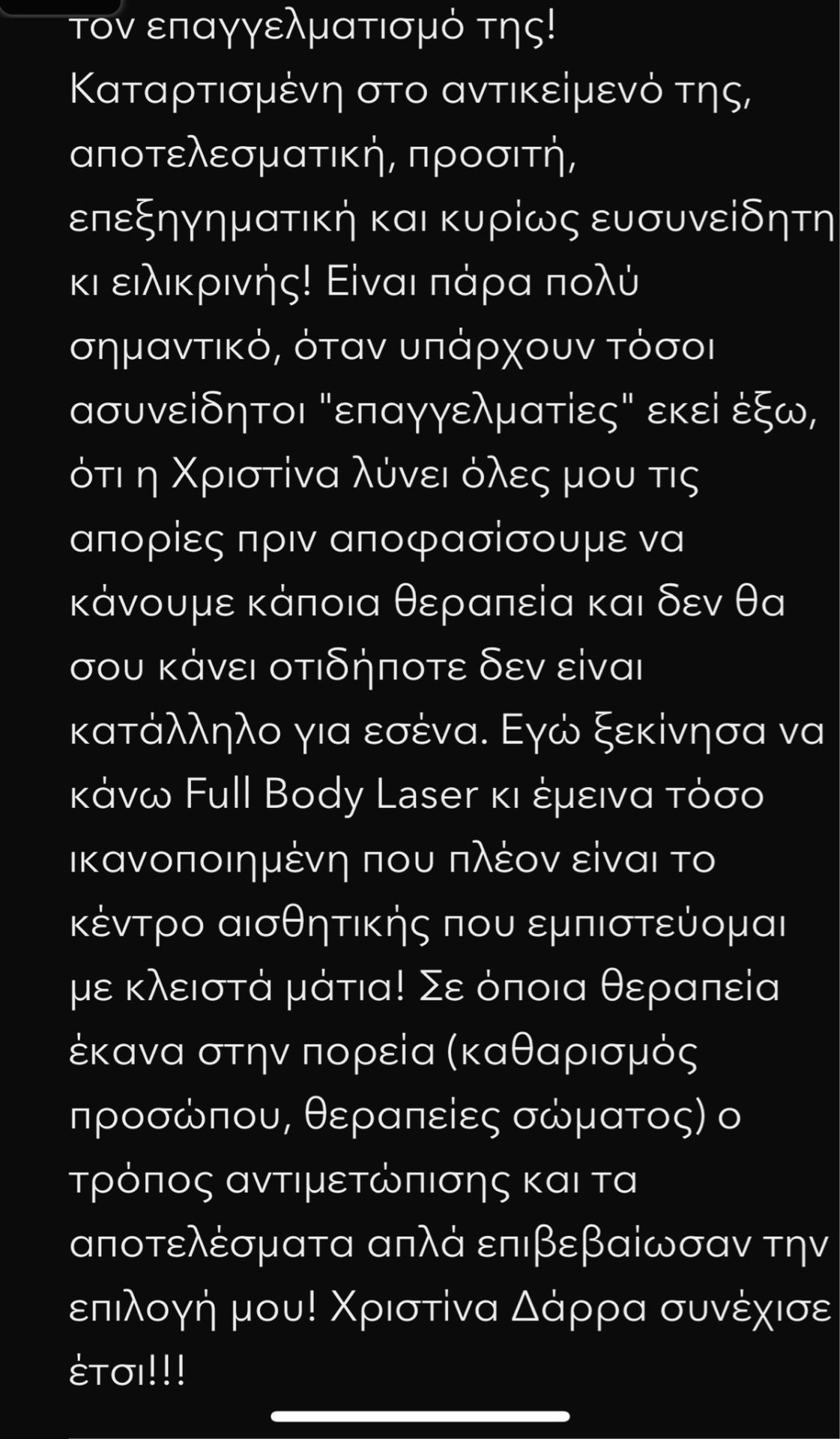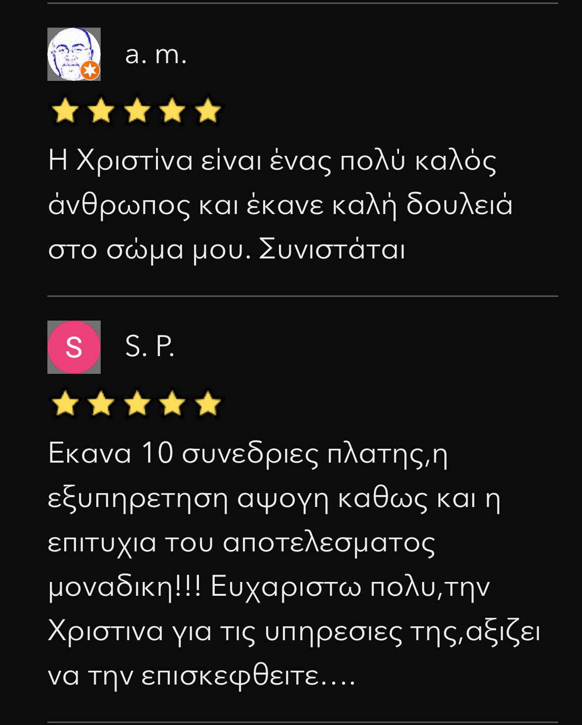 Έκανα θεραπεία για σύσφιξη. Στην αρχή ήμουν επιφυλακτική για το αποτέλεσμα. Τώρα που σχεδόν ολοκληρώθηκε είμαι ενθουσιασμένη. Εκπληκτικό αποτέλεσμα και στα μπράτσα. Μπράβο Χριστίνα. Συνέπεια , Καθαριότητα , Ποιότητα, Επαγγελματισμός , Σχέση ποιότητας-τιμής.