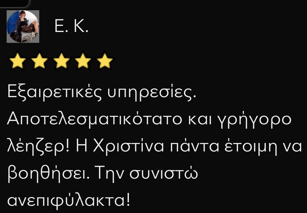 Η Κ Δάρα κάνει εξαιρετικά αποτελεσματική ριζική αποτρίχωση , με καθαρό αποτέλεσμα που διαρκεί. Είναι προσεκτική , γρήγορη και εξαιρετική επαγγελματίας .Τη συστήνω χωρίς δεύτερη σκέψη.