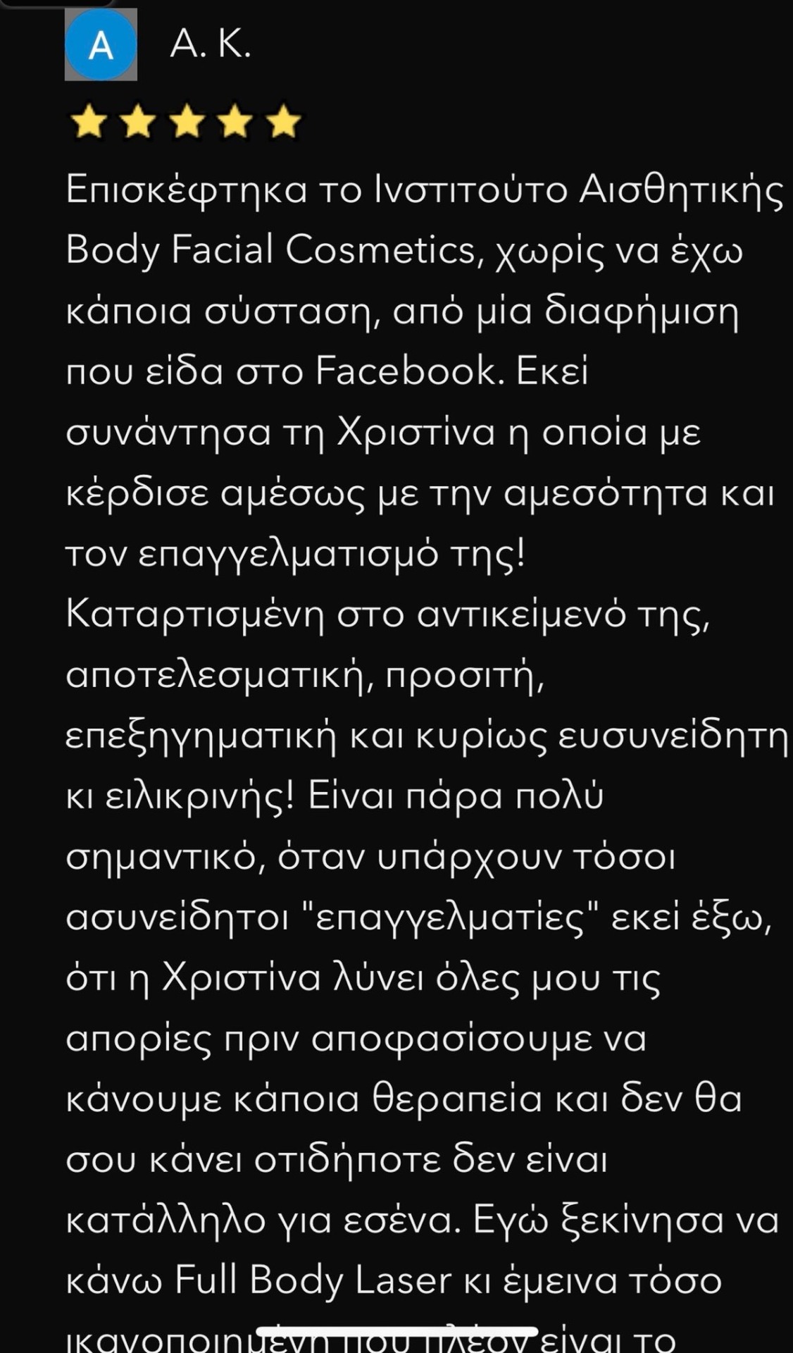 Άψογη επαγγελματίας και αξιόλογος άνθρωπος με αγάπη για αυτά που κάνει. Λέει πράγματα όπως είναι στην πραγματικότητα χωρίς να "χαιδευει" αφτιά και να τάζει ψεύτικα αποτελέσματα .Πλήρως καταρτισμένη στο πεδίο πάνω στο οποίο εργάζεται. Συνεπής και ευχάριστη. Σε ότι και αν αναλάβει τα αποτελέσματα είναι εγγυημένα. Την συνιστώ ανεπιφύλακτα τόσο σε θεραπείες σώματος όσο και στο laser , για τα οποία έχω ιδία γνώμη.